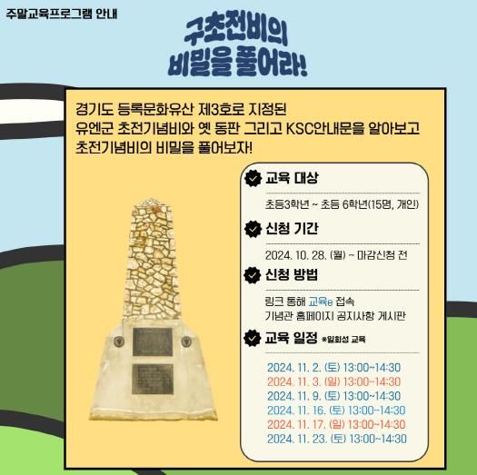‘구초전비의 비밀을 풀어라!’는 기념관 소장 유물이자 경기도 등록문화유산 제3호로 지정된 유엔군 초전기념비와 옛 동판 그리고 KSC 안내판에 대해 알아본 후 포일아트로 초전기념비와 KSC 부대원을 꾸미는 프로그램이다.