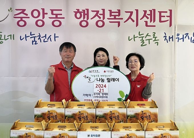 미디어라이프 중부신문 이종인 기자 | 오산시 중앙동은 지난 12일 중앙동 지역사회보장협의체 우기제 위원장, 함제희 위원이 관내 저소득 취약계층을 위해 호박즙 500개를 기탁했다고 전했다.