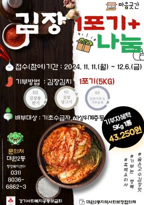 미디어라이프 중부신문 이종인 기자 | 오산시 대원2동 지역사회보장협의체는 '2024년 김장 1포기+ 나눔행사'를 이달 11일부터 다음달 6일까지 4주간 진행한다.