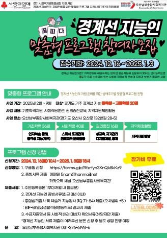 참가 신청은 2025년 1월 3일까지 오산남부종합사회복지관 홈페이지 공지사항 ‘경계선 지능인 생애주기별 맞춤형 프로그램 참여자 모집 ’ QR코드를 통해 신청 가능하다.