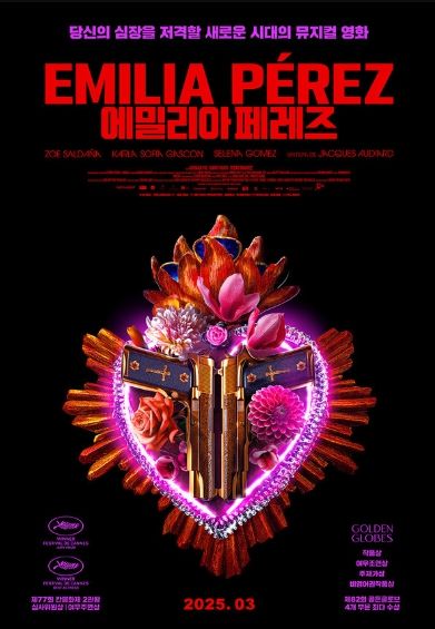 3월 개봉 확정과 함께 공개된 '에밀리아 페레즈'의 티저 포스터에는 꽃과 총이 함께 어우러져 있는 심장 모양의 심볼이 중앙에 박혀 있어 영화에 대한 궁금증을 자극한다.