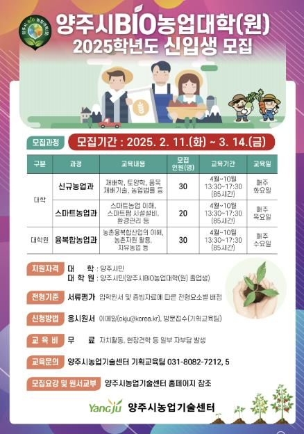 미디어라이프 중부신문 이도경 기자 | 양주시가 오는 3월 14일까지 ‘2025년 양주시 BIO농업대학 제20기 및 대학원 제15기 신입생’을 모집한다고 밝혔다.