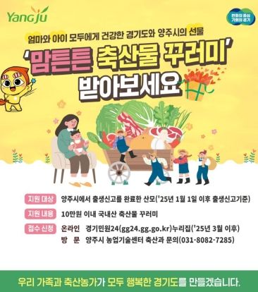 이 사업은 올해 출산 후 양주시에서 출생 신고를 마친 산모를 대상으로 진행되며, 10만 원 상당의 한우와 한돈 등 축산물 꾸러미가 제공된다. 신청은 2025년 3월 4일부터 경기민원24 누리집 '경기민원 신청' 페이지에서 산모 본인이 직접 해야 한다.