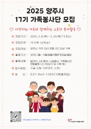 미디어라이프 중부신문 이도경 기자 | 사)양주시자원봉사센터는 가족과 함께 건강한 가족문화를 만들고 지역사회에 긍정적인 변화를 이끌어낼 “제17기 양주시 가족봉사단”을 모집한다고 10일 밝혔다.