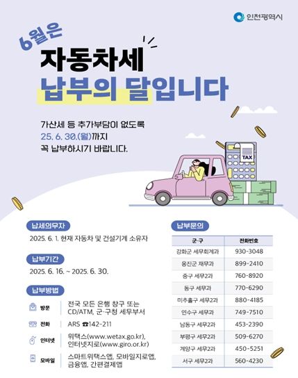 자동차세는 매년 6월과 12월 두 차례 부과되며, 이번 6월분 자동차세는 6월 1일 기준으로 인천시에 등록된 자동차 및 건설기계(덤프트럭, 콘크리트믹서트럭 등)의 소유자에게 부과된다.