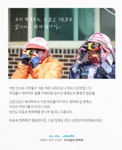 ‘내 마음의 방파제’ 방축도 사진전은 방축도 워케이션 센터에서 매일 오전 9시부터 오후 5시까지 누구나 자유롭게 관람할 수 있다.