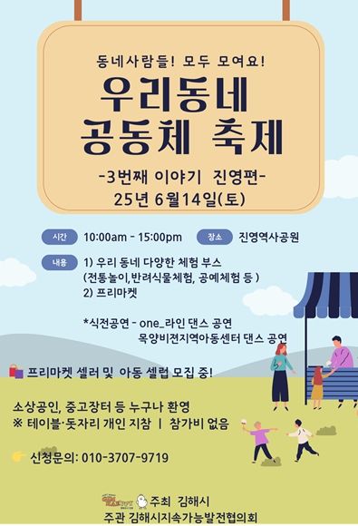 미디어라이프 중부신문 기자 | 김해시지속가능발전협의회는 오는 14일 오전 10시부터 오후 3시까지 진영역사공원에서 ‘우리동네 공동체 축제’를 개최한다고 11일 밝혔다.