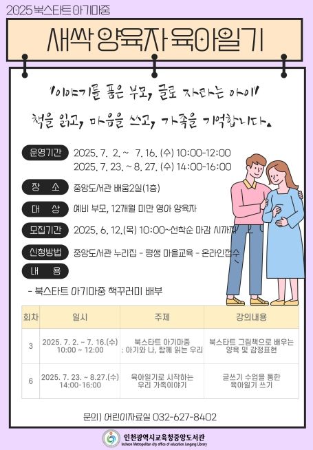 미디어라이프 중부신문 기자 | 인천광역시교육청중앙도서관은 임신부와 초기 양육자를 위한 ‘북스타트 새싹 양육자 육아일기’ 프로그램 참여자를 모집한다.