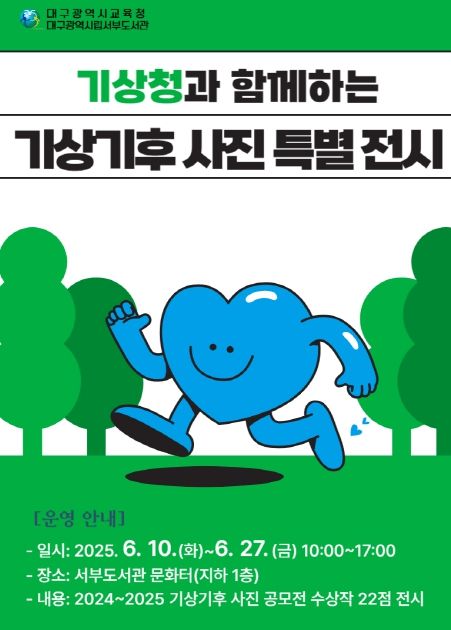미디어라이프 중부신문 기자 | 대구서부도서관은 기상과 기후에 대한 이해를 돕고, 기후변화의 심각성과 자연현상의 중요성을 알리기 위해 6월 10일부터 6월 27일까지 ‘기상기후 사진 특별 전시회’를 운영한다.