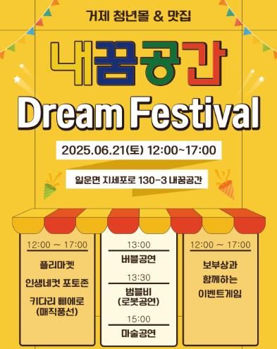 미디어라이프 중부신문 기자 | 거제시는 오는 6월 21일 낮 12시부터 오후 5시까지 일운면 지세포로 130-3에 위치한 ‘내꿈공간’에서 ‘2025 내꿈공간 드림 페스티벌’을 개최한다고 밝혔다.