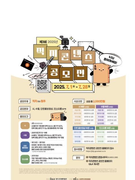 공모전을 통해 채택된 작품은 부문별로 시상하며 시, 수필은 추후 직지콘텐츠 공모전 작품집으로 출간되고 영상, 인스타툰은 청주시 다양한 홍보 매체에 게재될 계획이다.