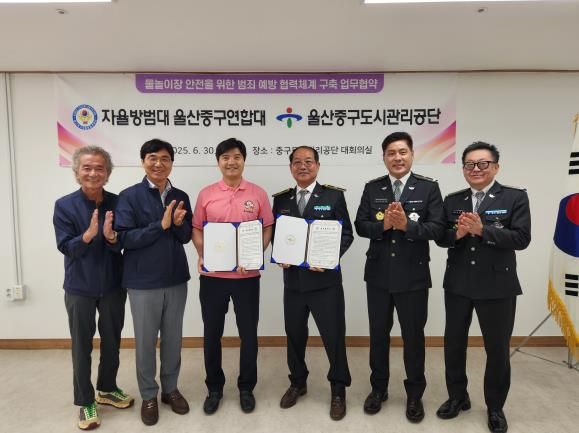 미디어라이프 중부신문 이건영 기자 | 울산중구도시관리공단과 자율방범대 울산중구연합대가 6월 30일 오전 11시 울산중구도시관리공단 대회의실에서 ‘지역사회 안전 문화 정착 및 범죄 예방’ 업무협약을 맺었다.
