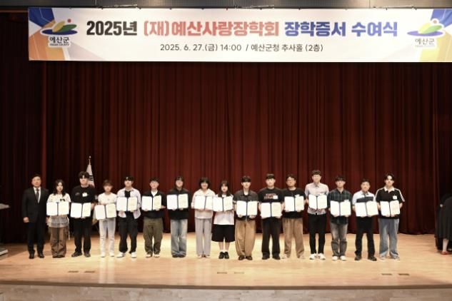 미디어라이프 중부신문 이건영 기자 | 예산군은 지난 6월 27일 군청 추사홀에서 (재)예산사랑장학회가 2025년도 장학생 장학증서 수여식을 개최하고 관내외 중·고등학생 및 대학생 총 250명에게 장학증서를 전달했다고 1일 밝혔다.
