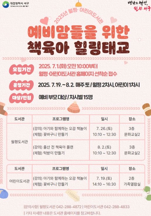 미디어라이프 중부신문 이건영 기자 | 대전 서구 월평도서관과 어린이도서관은 오는 7월 19일부터 8월 2일까지 매주 토요일, 임신부를 대상으로 ‘예비맘들을 위한 책 육아 힐링 태교’ 프로그램을 운영한다.