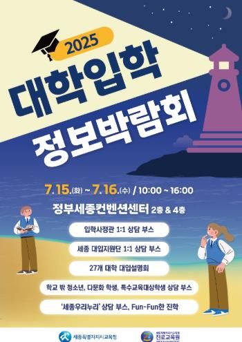 미디어라이프 중부신문 이건영 기자 | 세종특별자치시교육청진로교육원은 7월 15일 ~ 7월 16일에 이틀간 오전 10시부터 오후 4시까지 정부세종컨벤션센터에서 ‘2025 대학입학정보박람회’를 개최한다.
