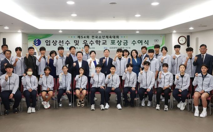미디어라이프 중부신문 이건영 기자 | 대전시교육청은 6월 30일 본관 701호 회의실에서 5월 24일부터 27일까지 경상남도 일원에서 열린 제54회 전국소년체육대회에서 뛰어난 실력을 발휘하여 역대 최고 성적을 달성한 금메달 입상선수 25명, 최우수선수 선정 학생 4명 및 우수학교 선정 학교장과 운동부 지도교사 등을 초청하여 포상금 수여식을 진행했다고 밝혔다.