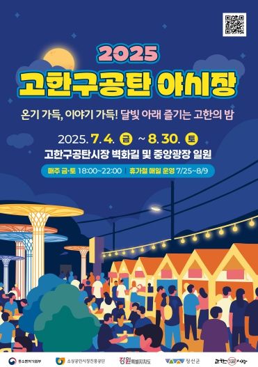 미디어라이프 중부신문 이건영 기자 | 강원특별자치도 정선의 여름밤이 뜨거워진다. 고한구공탄시장 상인회와 문화관광형시장 육성사업단은 오는 7월 4일부터 8월 30일까지 고한구공탄시장 벽화길과 중앙광장 일원에서 ‘온기 가득 달빛산책’을 주제로 한 ‘2025 고한구공탄 야시장’을 개장한다고 밝혔다.