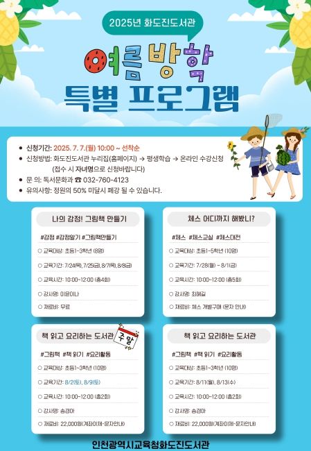 미디어라이프 중부신문 이건영 기자 | 인천광역시교육청화도진도서관은 여름방학을 맞아 7월 24일부터 8월 13일까지 초등학생 1~5학년을 대상으로 특별프로그램을 운영한다.