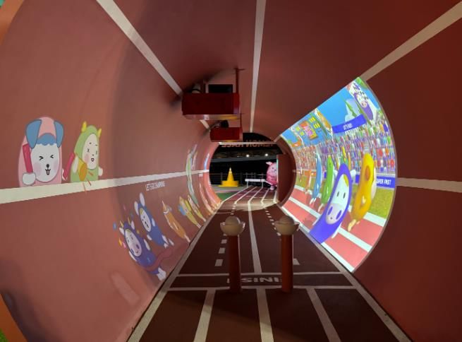 실제 레이스가 펼쳐지는 듯한 러닝트랙이 깔려 있고, 십이몬 캐릭터들이 그 위에 배치되어 관람객과 상호작용한다.