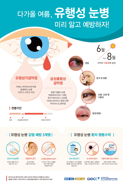 유행성 눈병은 바이러스에 의한 질환으로 직접 접촉, 수영장 물에 의해서 감염이 이루어질 수 있으며, 주요 증상은 안구의 충혈, 눈곱, 이물감, 간지러움 등으로 나타나고 심할 경우 각막 손상으로 인한 심한 통증이나 시력 저하가 발생하기도 한다. 또한 이 질환은 접촉을 통해 쉽게 전파되며 매년 가을까지 증가 추세를 보이므로 특히 어린이집, 유치원, 학교 등 단체생활을 하는 시설에서는 지속적인 주의가 필요하다.