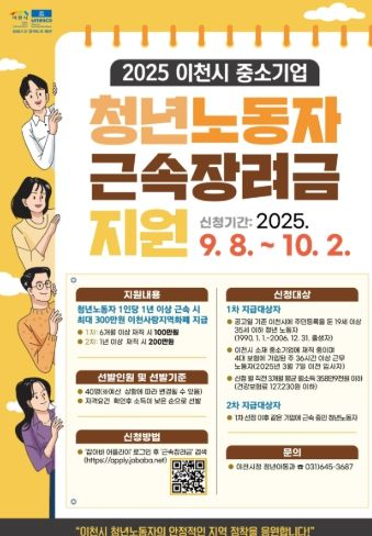 미디어라이프 중부신문 이종인 기자 | 이천시는 9월 8일부터 10월 2일까지 ‘2025년 하반기 이천시 중소기업 청년 노동자 근속장려금 지원사업’ 참여자를 모집한다고 밝혔다.