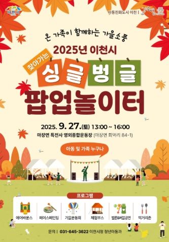 미디어라이프 중부신문 이종인 기자 | 이천시는 아동친화도시 놀이문화 확산과 아동의 놀 권리 보장을 위해 '찾아가는 싱글벙글 팝업 놀이터 ‘가을소풍’' 행사를 오는 9월 27일 마장면 특전사 영외종합운동장에서 개최한다고 밝혔다.