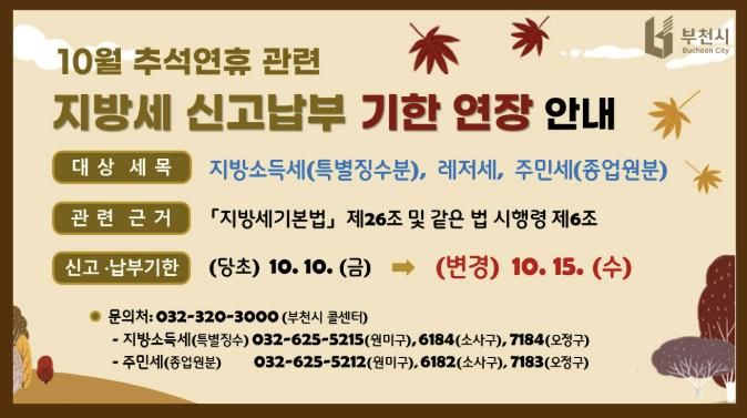 미디어라이프 중부신문 이종인 기자 | 부천시는 긴 추석 연휴로 인해 시민들이 지방세를 기한 내에 신고·납부하는 데 불편을 겪을 것으로 예상됨에 따라, 10월 납부 대상인 지방세 3종의 신고·납부 기한을 기존 10일에서 15일로 5일 연장한다고 밝혔다.