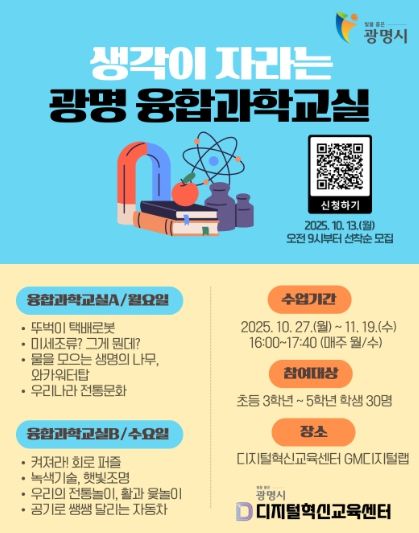 미디어라이프 중부신문 이종인 기자 | 광명시는 오는 10월 27일부터 11월 19일까지 초등학교 3~5학년을 대상으로 ‘생각이 자라는 광명 융합과학교실’ 시범수업을 운영한다.