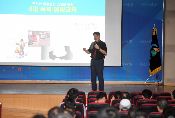 오산시는 지난 4월 성희롱 성폭력 피해자 보호 및 가해자 엄중징계가 강화된 ‘오산시 성희롱-성폭력 예방 지침’으로 전면 개정하였으며, 매년 전 직원 및 종사자 대상 성희롱, 성폭력, 성매매, 가정폭력 통합교육을 실시하고 있다. 이성 및 세대간 지켜야할 직장예절 및 배려하는 건전한 직장분위기를 위해 오는 11월에 전 직원 대상 폭력예방 2차 통합교육을 실시할 계획이다.
