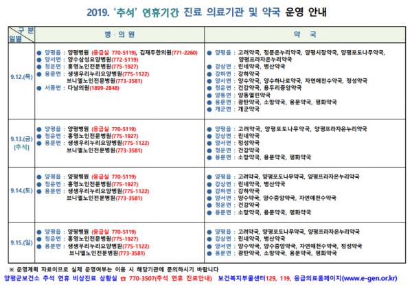 보건소 관계자는 “연휴기간 중 응급환자가 발생할 경우 당황하지 말고 119나 응급의료정보센터로 문의하면 환자에 대한 응급조치와 당직의료기관, 휴일지킴이 약국을 안내 받을 수 있다”고 말했다.