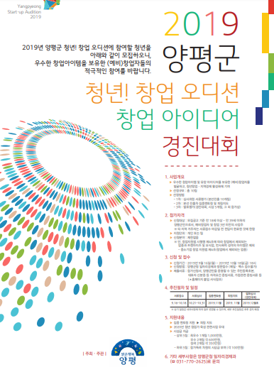 양평군은 지역의 유망 창업 아이템을 보유한 창업자를 발굴하고, 청년창업과 지역경제 활성화를 위하여 ‘2019년 청년 창업 오디션’ 참가자를 모집한다.
