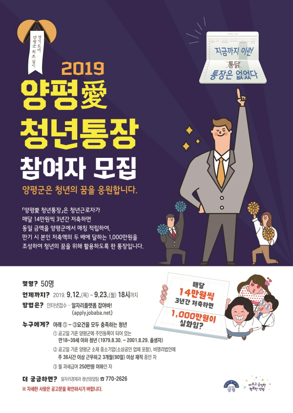 청년통장은 청년근로자가 매월 14만원을 저축하면 군에서 동일금액을 매칭 적립하여 3년간 최대 약 1,000만원의 자산을 형성하는 사업이다. 관내 기업에 취업을 촉진하고 중소기업 등 인력난 해소 및 장기근속 유도를 통해 청년들이 지역에 정착할 수 있는 환경을 조성하기 위해 경기도내 기초 지자체 중 양평군이 최초로 시행했다.