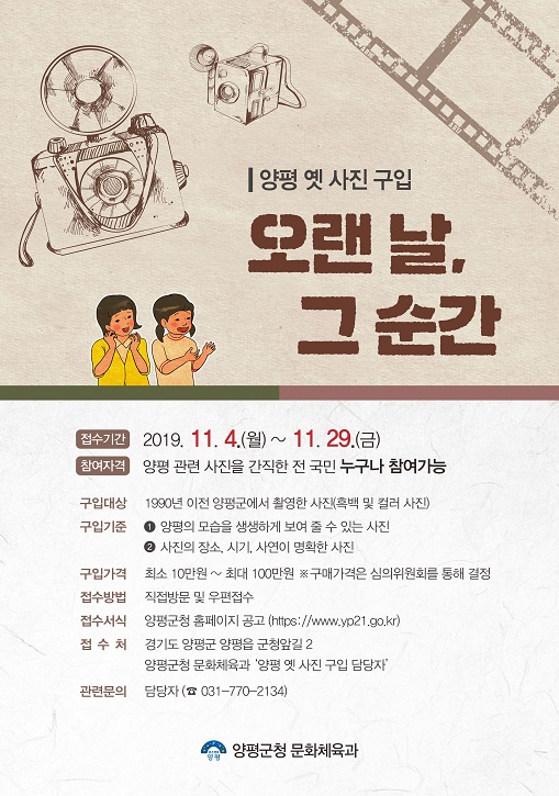 구입할 사진은 1990년 이전 양평에서 촬영한 사진으로 양평의 자연경관이나 관광명소, 지역 및 마을 축제, 문화행사 그리고 생활상 등 양평의 옛 모습과 생활을 회상할 수 있는 사진이라면 모두 가능하며 관련사진을 간직한 누구나 참여 할 수 있다.