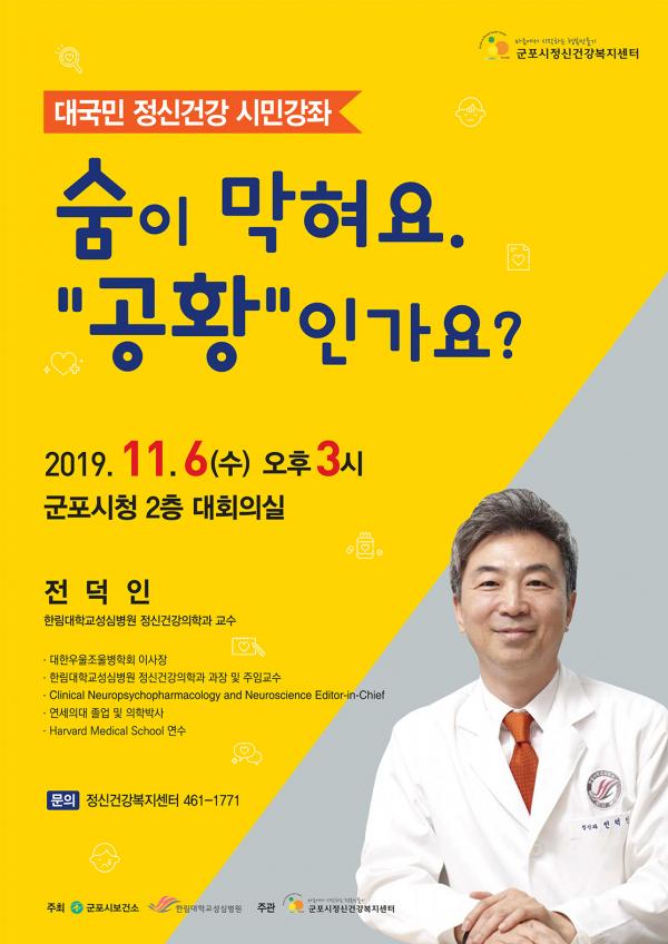 ‘숨이 막혀요, 공황인가요?’라는 주제의 강연을 군포시정신건강복지센터 주관으로 11월 6일 군포시청 2층 대회의실에서 진행할 예정이다.