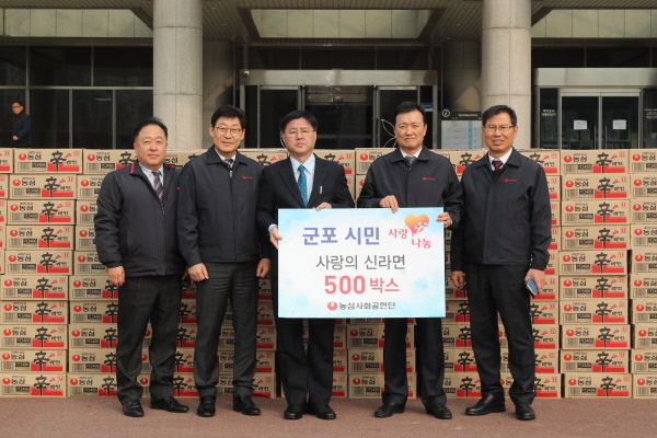 [미디어라이프(medialife)]㈜농심 사회공헌단이 지난 9일 군포시를 방문해, 취약계층을 위해 전해달라며 라면 500상자를 기탁했다.