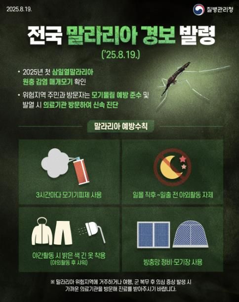 질병관리청은 31주차(7월 27일~8월 2일)에 채집된 말라리아 매개 모기(얼룩날개모기류)에서 삼일열원충 감염이 확인됨에 따라 8월 19일 전국에 말라리아 경보를 발령했다.
