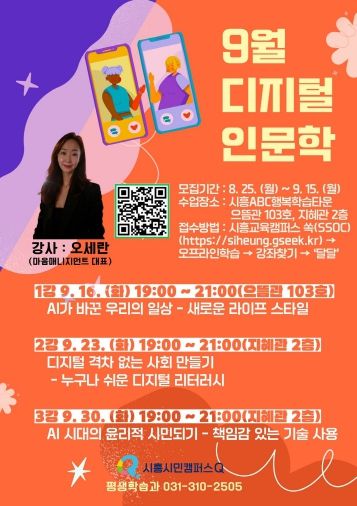 우선, 9월 강의는 9월 16일(인공지능(AI)이 바꾼 우리의 일상), 9월 23일(디지털 격차 없는 사회 만들기), 9월 30일(인공지능 시대의 윤리적 시민 되기) 등으로 구성됐으며, 마음매니지먼트 오세란 대표가 강의를 진행한다.