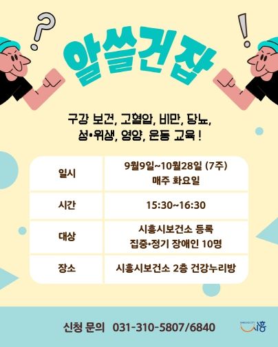 미디어라이프 중부신문 이종인 기자 | 시흥시는 오는 9월 9일부터 10월 28일까지 관내 장애인의 건강관리를 돕기 위해 ‘알쓸건잡(알아두면 쓸모 있는 건강 잡학사전)’ 프로그램을 시흥시보건소 2층 건강누리방에서 운영한다.