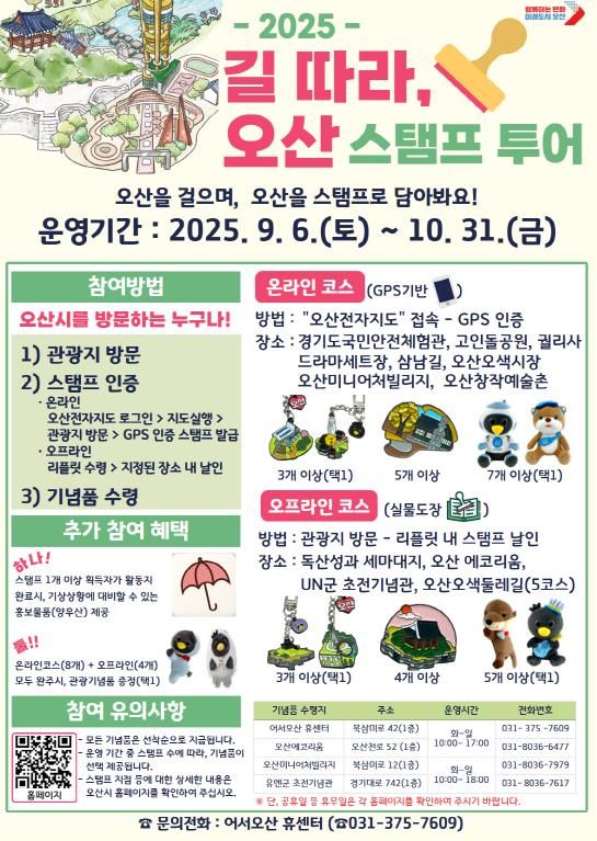 미디어라이프 중부신문 이종인 기자 | 오산시는 9월 6일부터 10월 31일까지 가을철 관람객을 맞이하기 위해 ‘길 따라, 오산’ 스탬프 투어를 운영한다고 밝혔다.