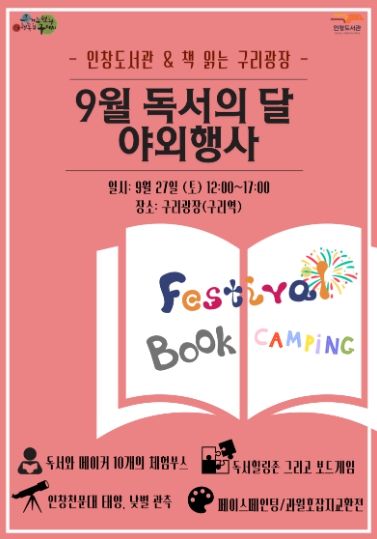 미디어라이프 중부신문 김민정 기자 | 구리시 인창도서관은 9월 독서의 달을 맞아 오는 9월 27일 오후 12시부터 5시까지, 시민 누구나 참여할 수 있는 야외 독서문화 행사 『책 읽는 구리광장』을 운영한다고 밝혔다.