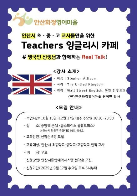 미디어라이프 중부신문 이종인 기자 | 안산시 안산화정영어마을은 오는 15일부터 12월 17일까지 관내 소속 교사를 대상으로 ‘티처스(Teachers) 잉글리시 카페’를 운영한다고 10일 밝혔다.