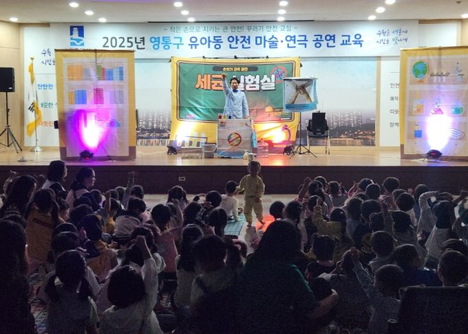 미디어라이프 중부신문 이종인 기자 | 수원시 영통구는 2025. 10. 13. 영통구청 대회의실에서 관내 유아를 대상으로 안전한 위생 습관을 형성하기 위한 ‘찰리박사의 세균실험실’ 체험형 안전마술·연극 공연 교육을 실시했다.