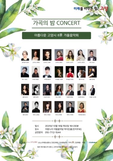 미디어라이프 중부신문 이종인 기자 | 고양특례시가 후원하고, (사)한국예술문화단체총연합회 고양지회가 주최하며 (사)한국음악협회 고양지부가 주관하는 ‘2025 가곡의 밤 – 아름다운 고양시 8경(景) 가을 음악회’가 오는 16일 오후 7시 30분, 고양아람누리 아람음악당에서 개최된다.