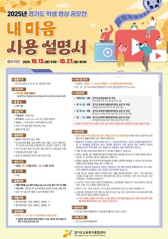 미디어라이프 중부신문 이종인 기자 | 경기도교육복지종합센터가 경기도교육청 소속 초 중 고등학교 학생들을 대상으로 ‘2025년 경기도 학생 영상 공모전’을 개최한다.