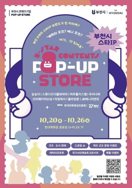 미디어라이프 중부신문 이종인 기자 | 부천시는 10월 20일부터 26일까지 현대백화점 중동점 U-PLEX 1층에서 지역 우수 콘텐츠 기업 8개 사가 참여하는 팝업스토어 ‘8 CONTENTS, ONE STAGE in BUCHEON’을 운영한다.