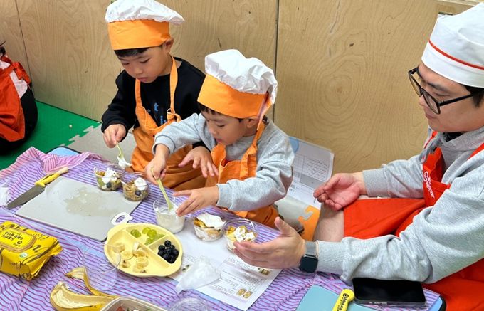 어린이 참가자들은 떠먹는 밥피자, 병아리콩 콥샐러드, 과일 요거트 파르페를 직접 만들면서 건강한 식습관을 배웠고, 함께 참여한 부모를 대상으로는 손 오염도 측정과 편식 예방 교육을 진행했다.