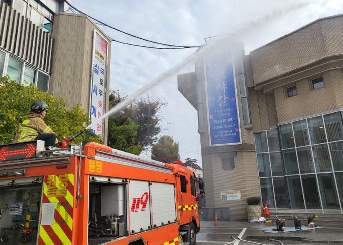 이날 훈련은 청사 내 화재 발생 상황을 가정해 ▲최초 화재 발견자의 상황 전파 및 119신고 ▲직원 및 민원인 대피 유도 ▲초기 화재진화 ▲환자이송 ▲경계활동 ▲응급 복구 순으로 진행됐다. 특히 실제 상황을 방불케 하는 단계별 훈련을 통해 참가자들의 위기 대응 능력을 점검했다.