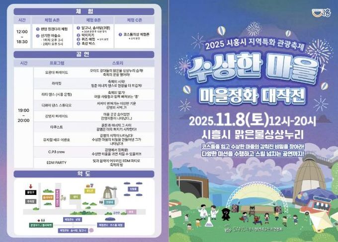 미디어라이프 중부신문 이종인 기자 | 시흥시는 2025년 시흥시 지역특화 관광축제 지원사업 선정 축제인 ‘수상한 마을 마을정화대작전’을 오는 11월 8일 정왕동 맑은물상상누리 일원에서 개최한다. 이번 축제는 시흥시 청년예술연합회가 주관한다.