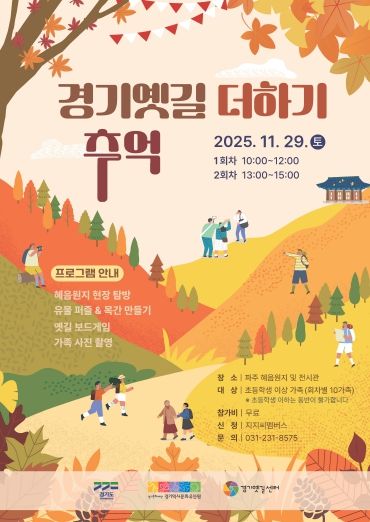 미디어라이프 중부신문 이종인 기자 | 경기문화재단 경기역사문화유산원는 오는 11월 29일 토요일, 의주길에 위치한 파주 혜음원지 일대에서 초등학생 이상 자녀를 둔 가족을 대상으로 하는 역사 체험 프로그램 ‘경기옛길 더하기 추억’을 개최한다고 밝혔다.