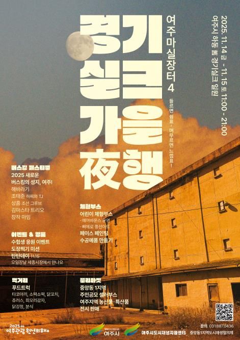 미디어라이프 중부신문 이종인 기자 | 여주시는 오는 11월 14일부터 15일까지 이틀간 여주 경기실크 일원(여주시 하동 123-6번지)에서 '여주마실장터4 가을야행'을 개최한다고 밝혔다. 이번 행사는 '2025 새로운 버스킹의 성지, 여주!'라는 슬로건 아래, 깊어가는 가을밤의 정취를 더할 버스킹 페스티벌과 함께 다채로운 마켓과 체험을 선보일 예정이다.